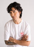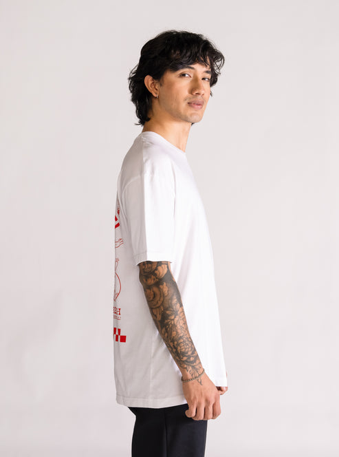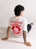 T-shirt color blanco, estilo Drop Shoulder, diseñada para un look relajado y moderno. Forma parte de la colección especial de Bob Esponja, creada para celebrar el impacto y la esencia divertida del personaje.